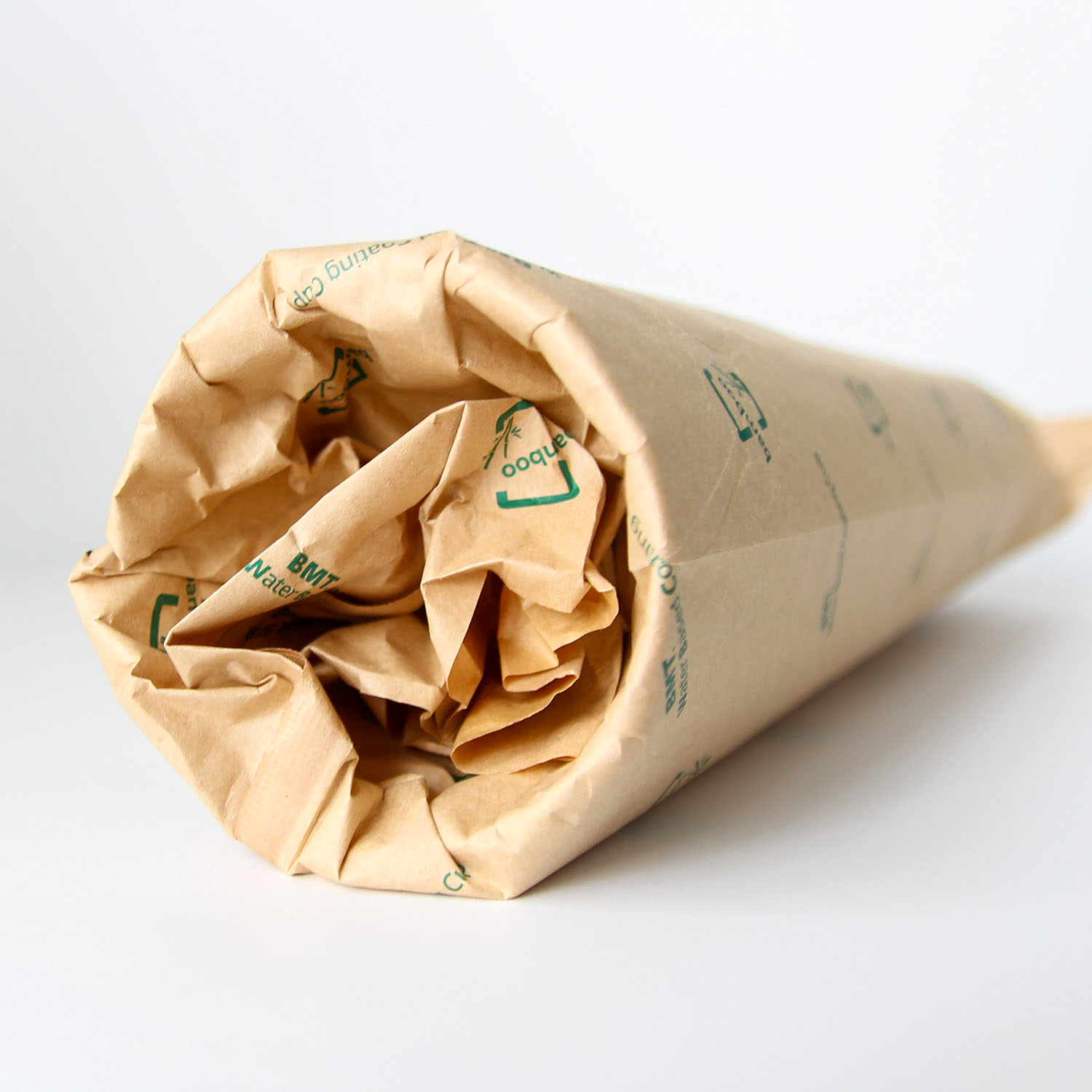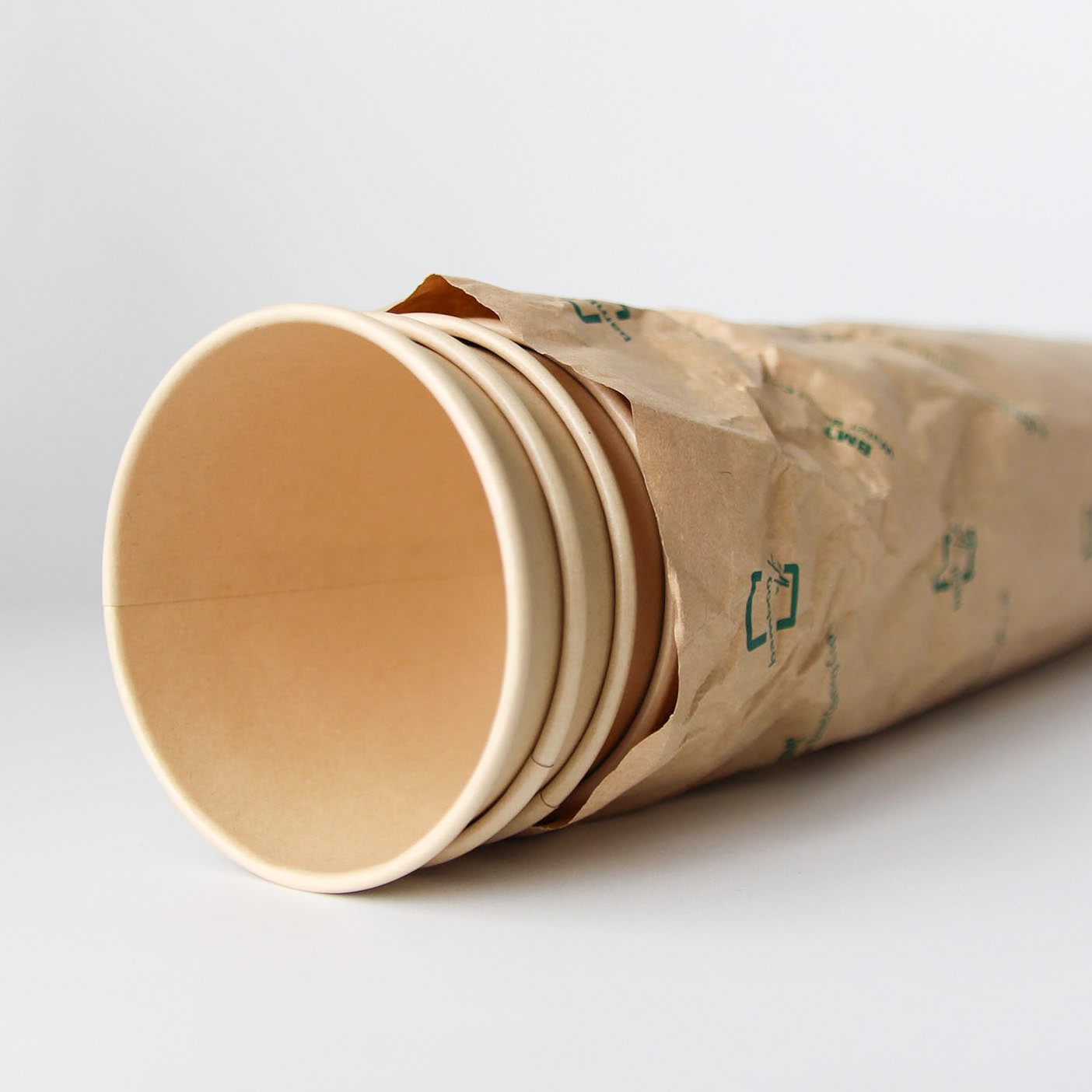 カップ内面の耐水コーティングには、従来のPE(ポリエチレン)コートではなく「水性コート」を採用しました。さらに、製品を包む梱包材にもビニールを一切使わず「紙」を使用。包材や底面に至るまで、徹底的にプラスチックフリーにこだわった究極のECOカップです。